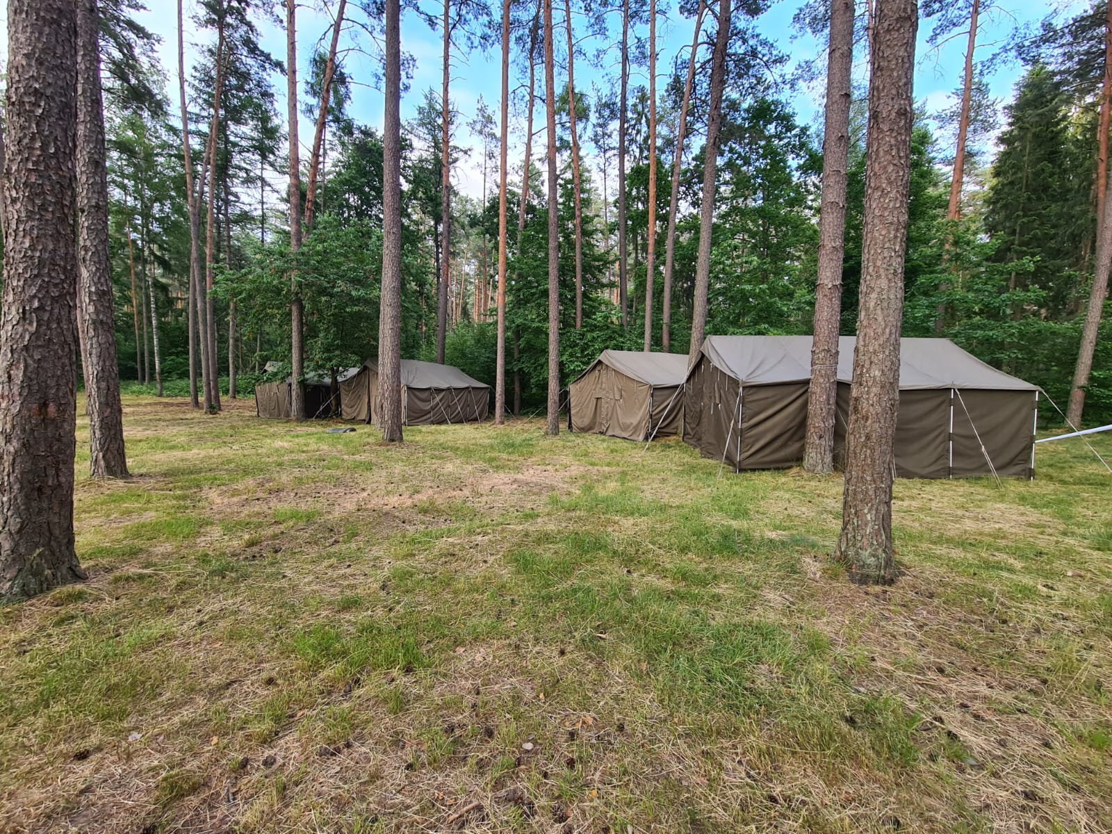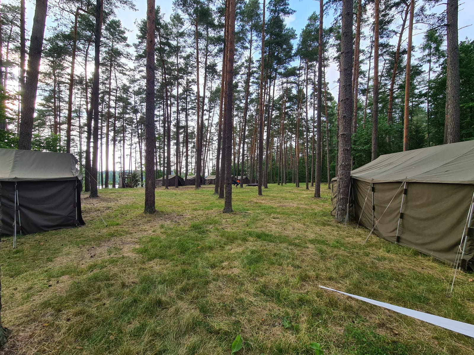 • wojskowe namioty 10-osobowe (dyszka) na leśnym obozowisku,